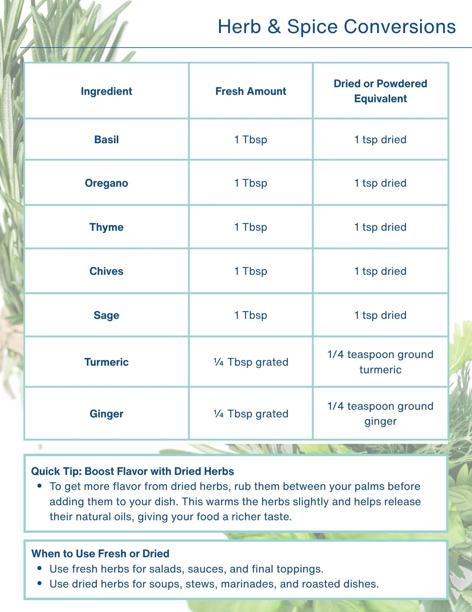 Fresh herbs and dried spices can both add incredible flavor to your meals—but knowing how to substitute one for the other makes cooking much easier. This quick guide breaks down common herb and spice conversions so you can adjust recipes with confidence, even when you’re missing an ingredient.