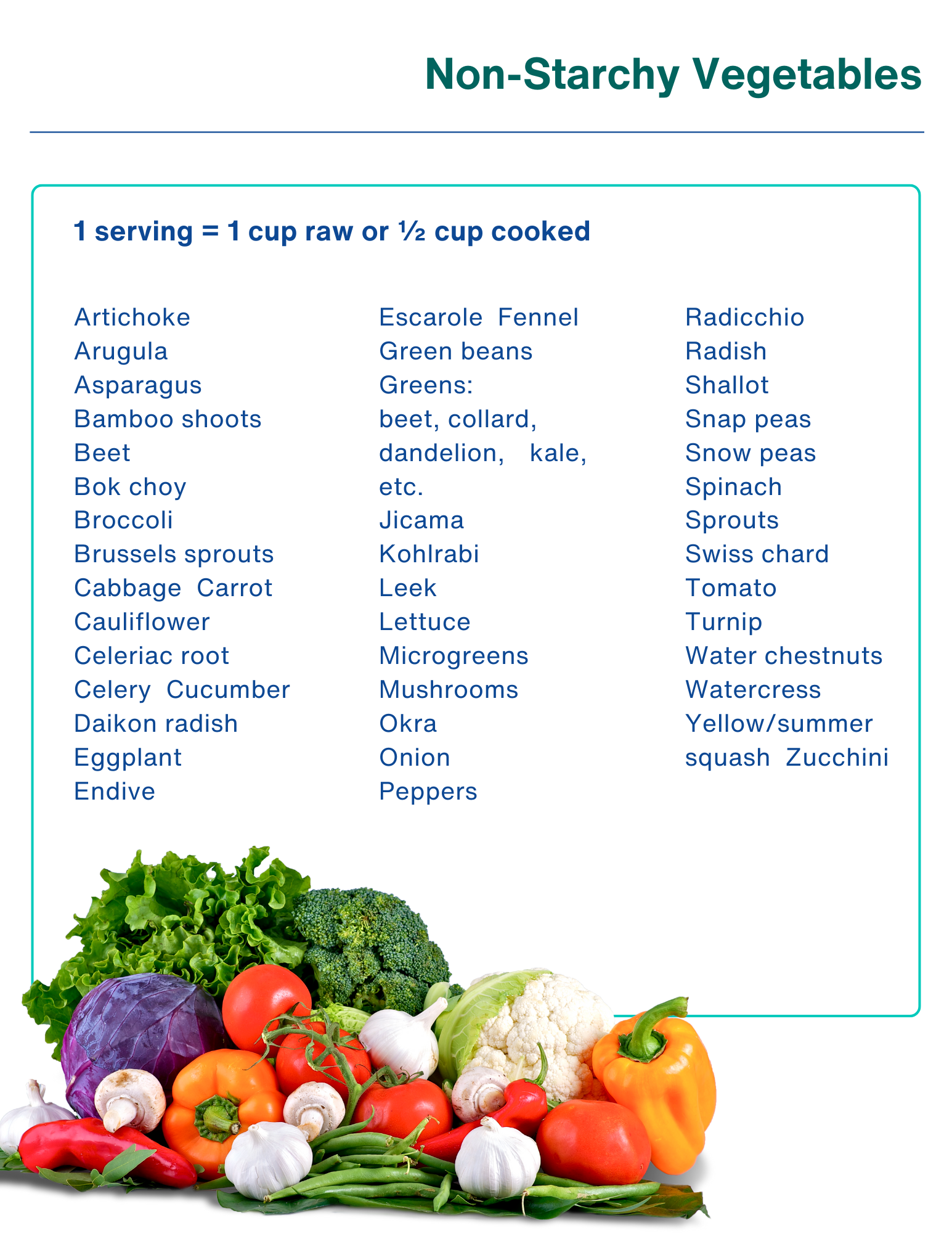 Non-starchy vegetables are rich in vitamins, minerals, and fiber—without adding many calories or carbohydrates. They’re a delicious way to fill your plate, boost nutrition, and add color to your meals.
