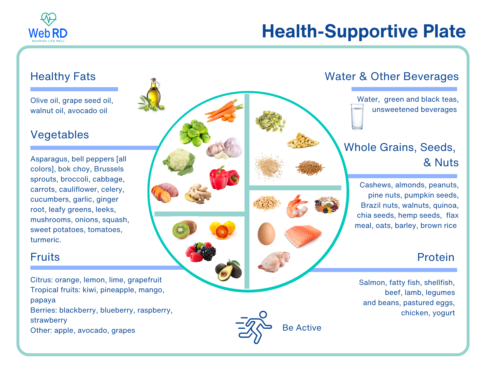 Building a balanced, health-supportive plate is about choosing nourishing foods that fuel your body and support long-term wellness. Each food group plays a vital role in providing energy, nutrients, and flavor to your meals.